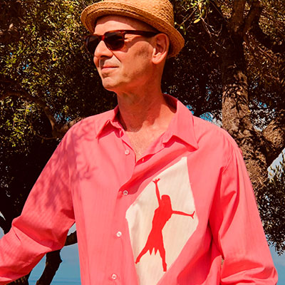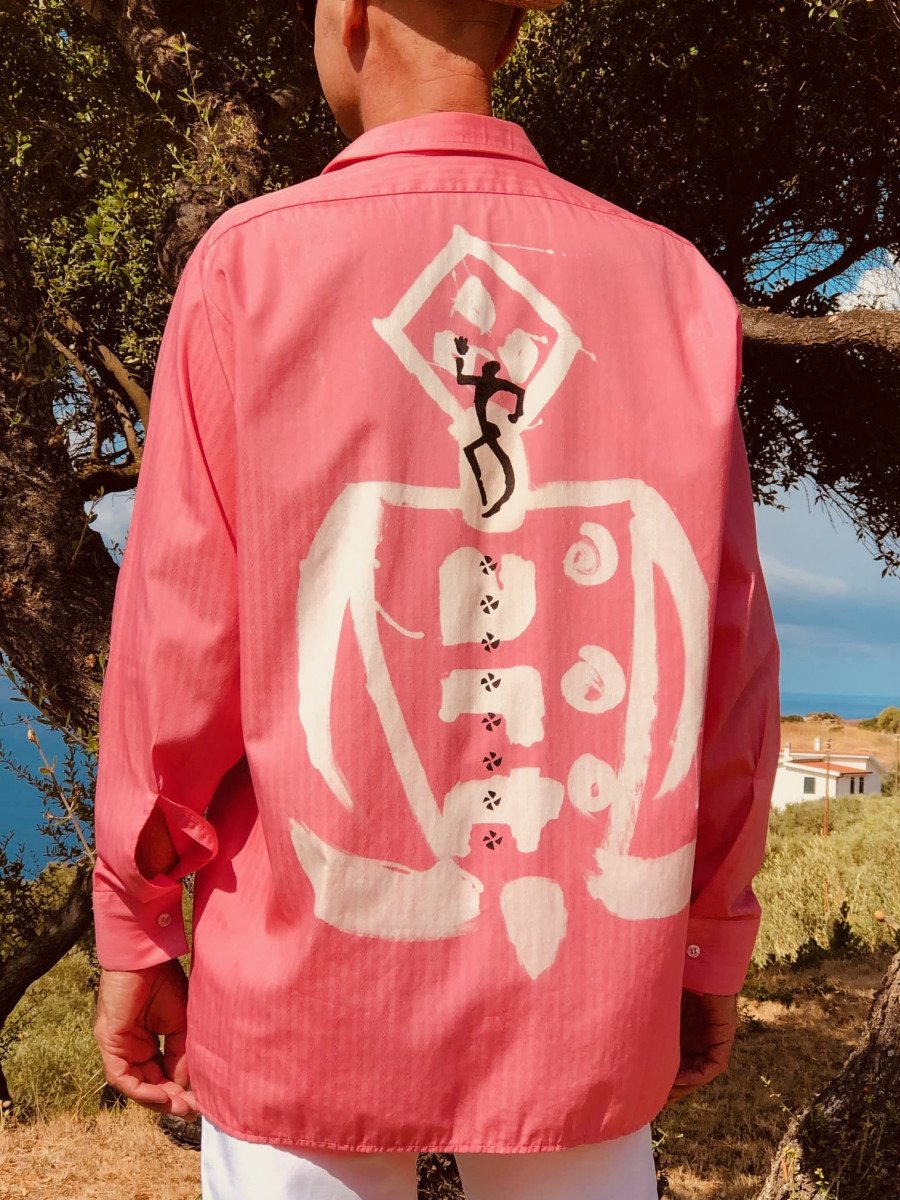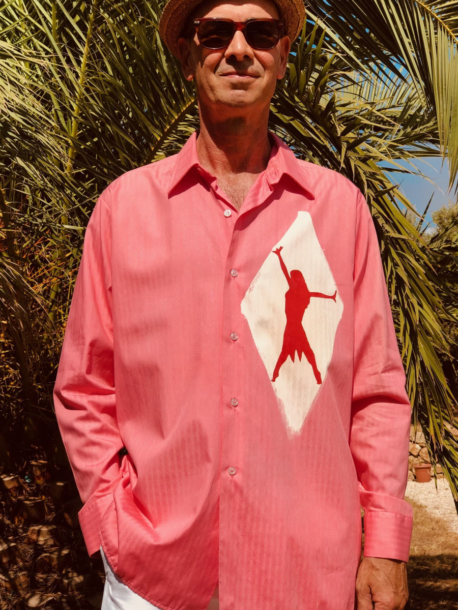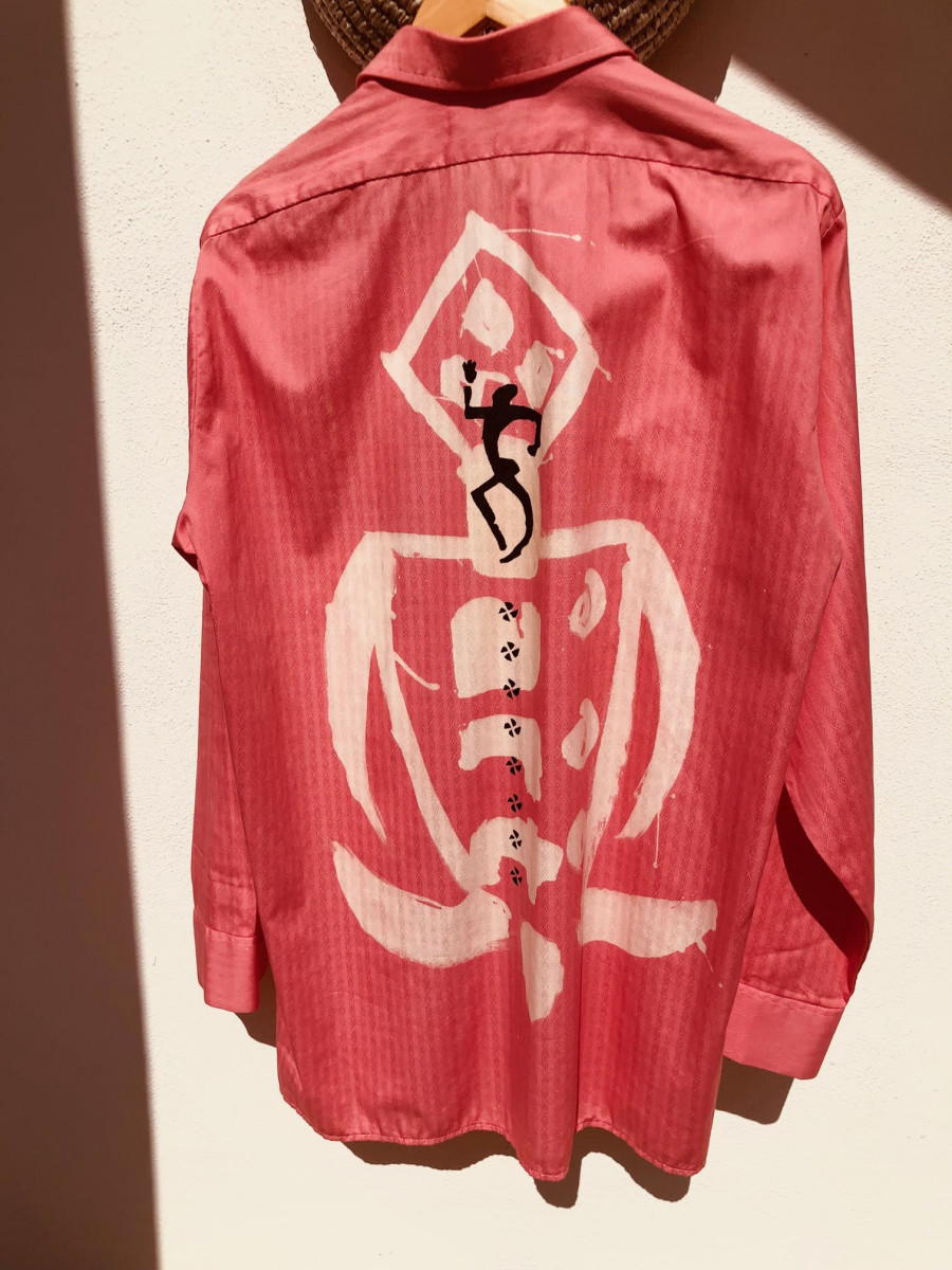 Elegantes Herrenhemd mit Stoffbemalungen, Druck und Pinsel auf Vorder-und Rückseite, Bügelfrei, Unikat.