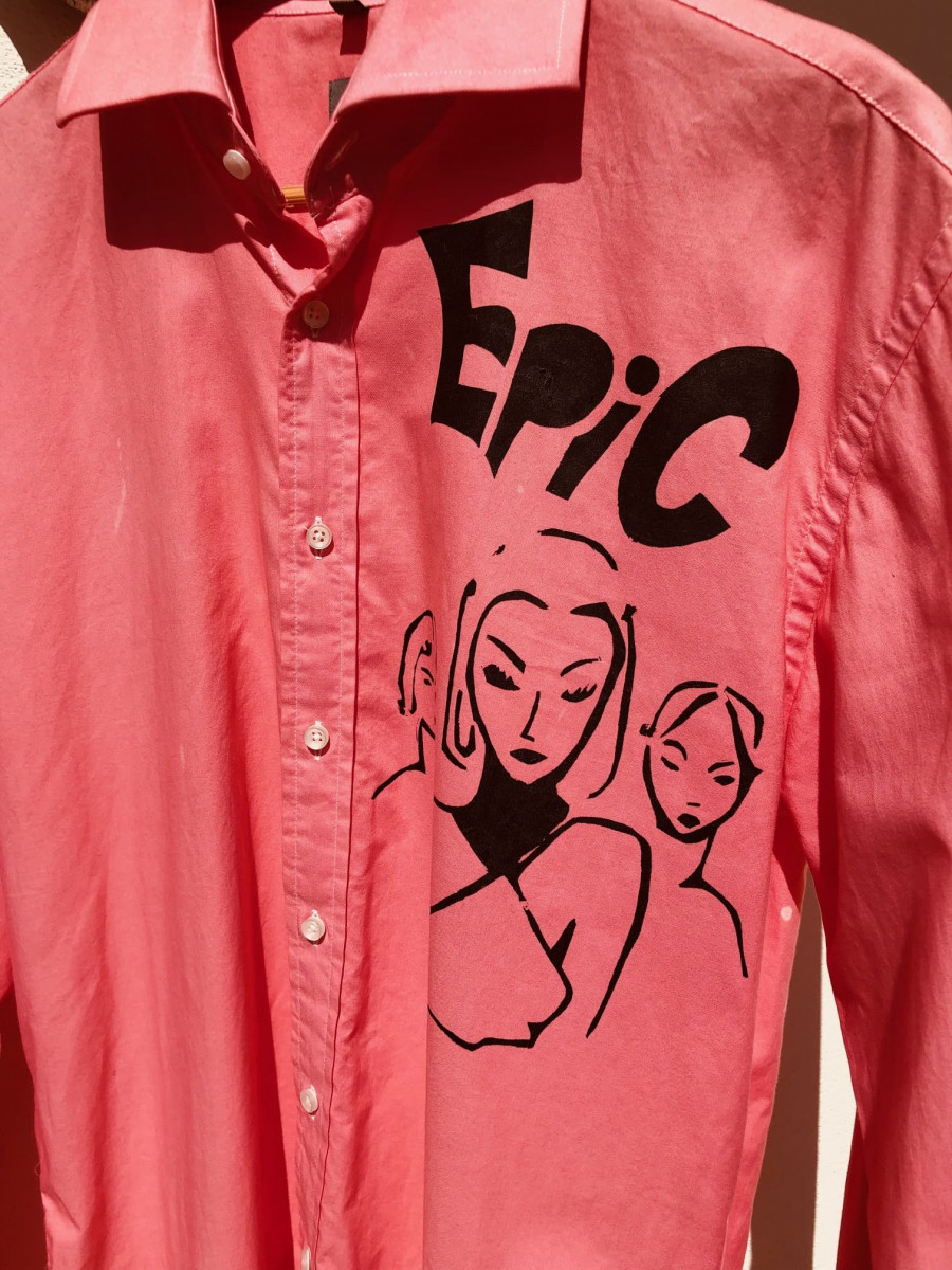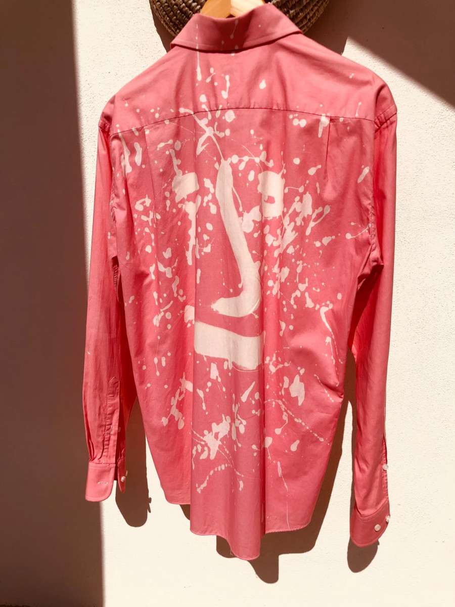Elegantes Herrenhemd mit Stoffbemalungen, Druck und Pinsel auf Vorder-und Rückseite, Unikat.