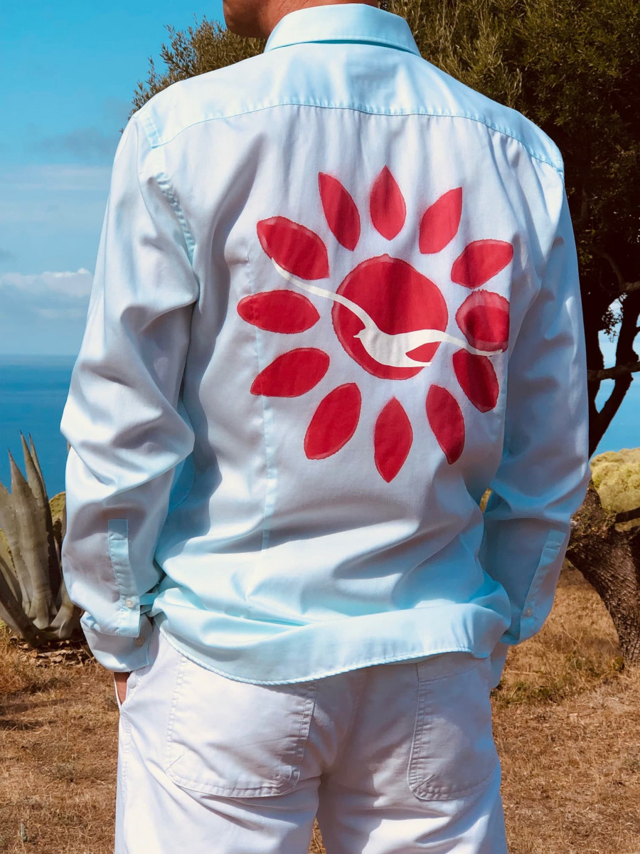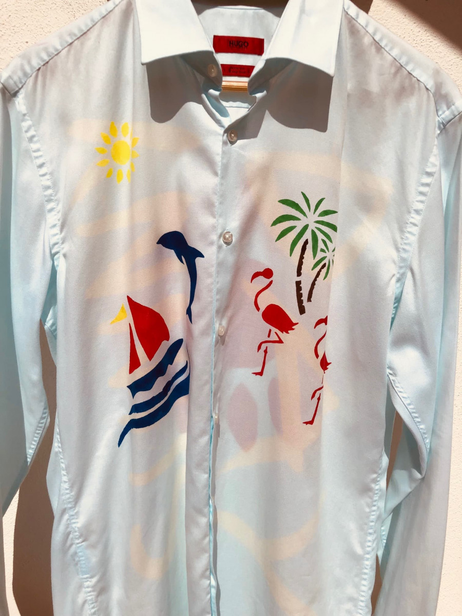 Modisches Herrenhemd mit Stoffbemalungen auf Vorder-und Rückseite, Unikat.