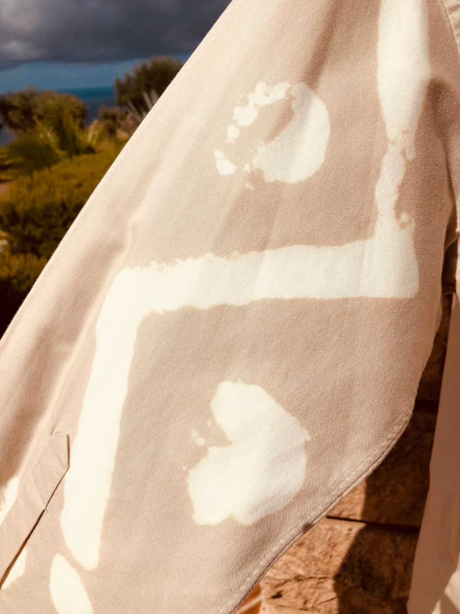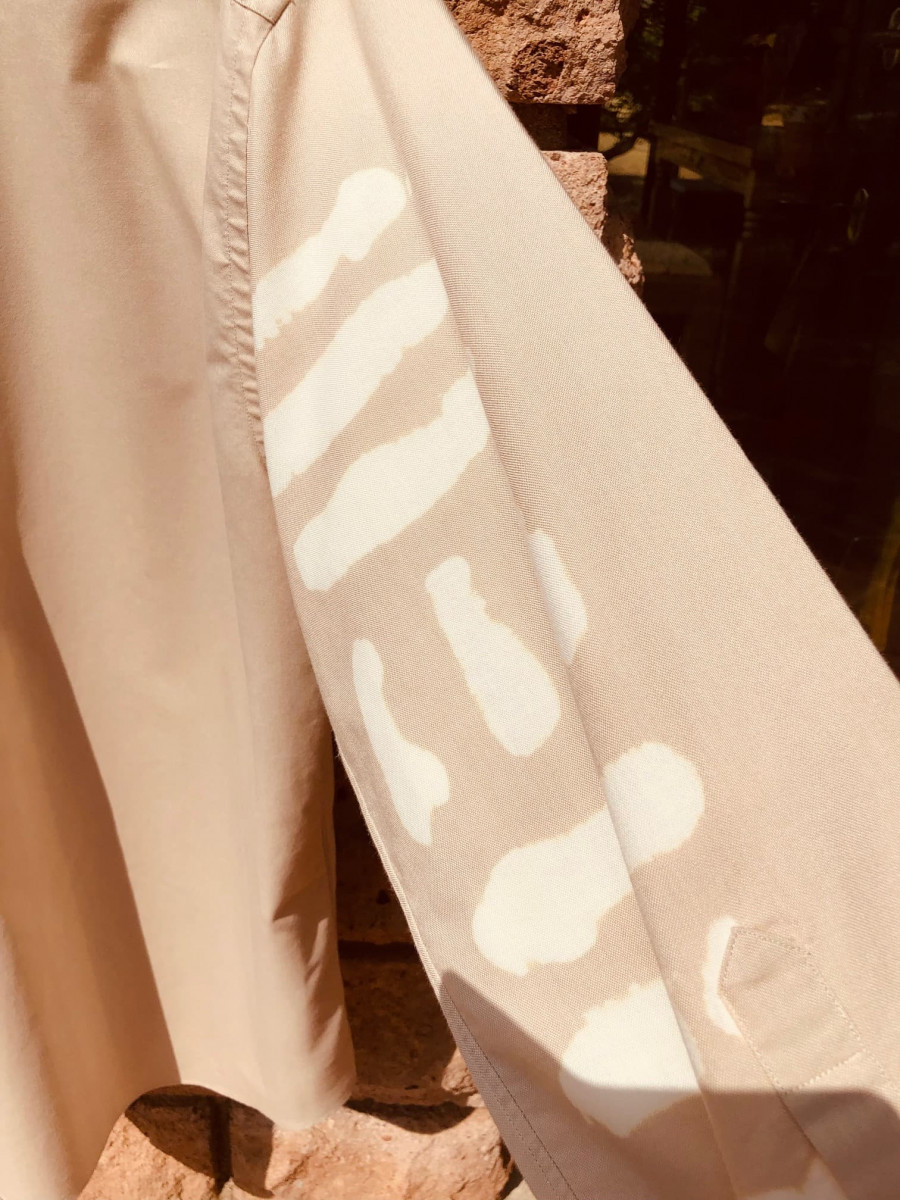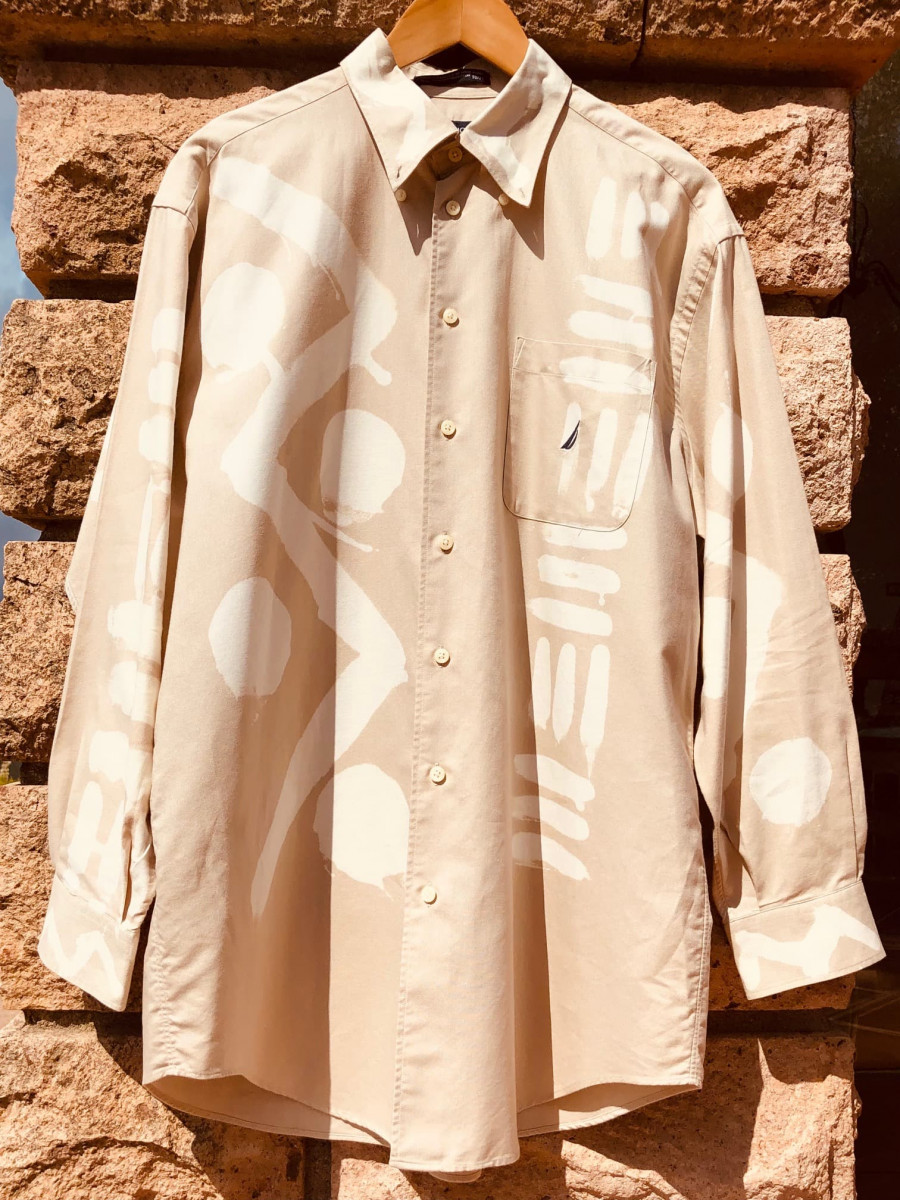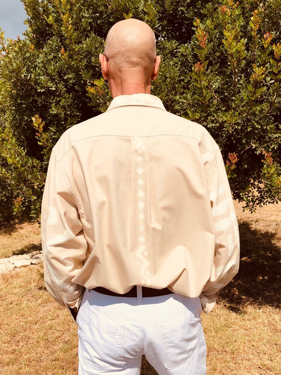 Herrenhemd mit Pinsel-Stoffbemalungen auf Vorder-und Rückseite sowie den Ärmeln und Kragen, Unikat.
